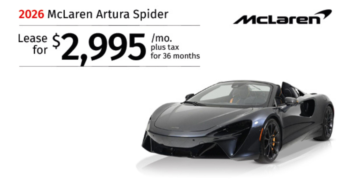 2025 McLaren Artura Spider. Stock #TW003998. MSRP $306,550. $2,995/mo. +tax. 36-month lease. $30,277 total due at signing. Includes first payment, tag, acquisition fee, dealer fee, and dealer installed options, if any. $0 security deposit. Lease end value $205,389. 2,500 miles per year, $2.75 per mile thereafter . Offer with approved with Tier 1 Credit through McLaren Financial and subject to availability. photos for illustration only. Offer ends 10/31/2025.