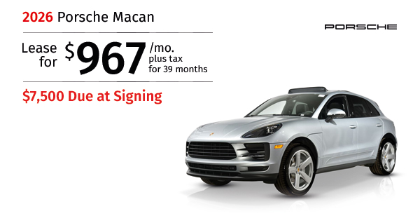 2026 Porsche Macan . Stock #TLB06322. MSRP $76,280. $967/mo. plus tax 39 months lease. $ Rebate. $7,500 Total due. Includes down payment, tax, first payment, tag, acquisition fees, dealer fee, and dealer installed options, if any. $0 security deposit. Lease...Request More Info