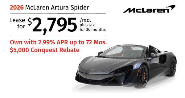 2026 McLaren Artura Spider. Stock #TW004230. MSRP $326,200. $2,795/mo. plus tax 36 months lease. $5,000 Conquest rebate vehicles include BMW (M5, M8, XM), Porsche (911, Taycan, 718), Ferrari (all models), Lamborghini, (all models), Mercedes-Benz (AMG GT 63, SL-63 Roadster, AMG...Request More Info