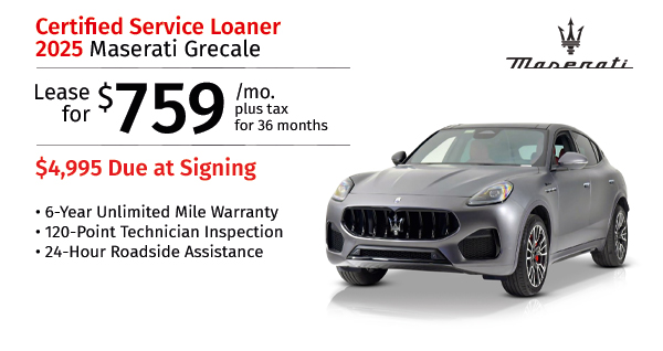 2025 Maserati Grecale Service Loaner. Stock #S7463118L. MSRP $84885. $759/mo. plus tax 36 months lease. $4995 Down payment. Excludes tax, first payment, tag, acquisition fees, dealer fee, and dealer installed options, if any. $0 security deposit. Lease end value $38895....Request More Info