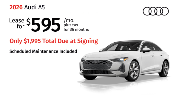 2026 Audi A5 . Stock #TN011863. MSRP $57360. $595/mo. plus tax 39 months lease. $0 Bonus cash. $1,995 Total due. Includes down payment, tax, first payment, tag, acquisition fees, dealer fee, and dealer installed options, if any. $0 security deposit....Request More Info