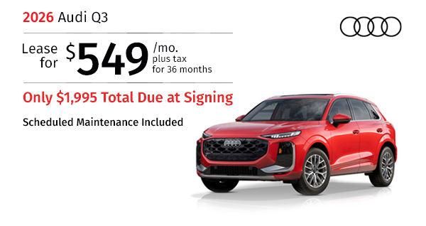 2026 Audi Q3. Stock #T1052719. MSRP $47325. $549/mo. plus tax 36 months lease. $0 Bonus cash. $1,995 Total due. Includes down payment, tax, first payment, tag, acquisition fees, dealer fee, and dealer installed options, if any. $0 security deposit. Lease...Request More Info
