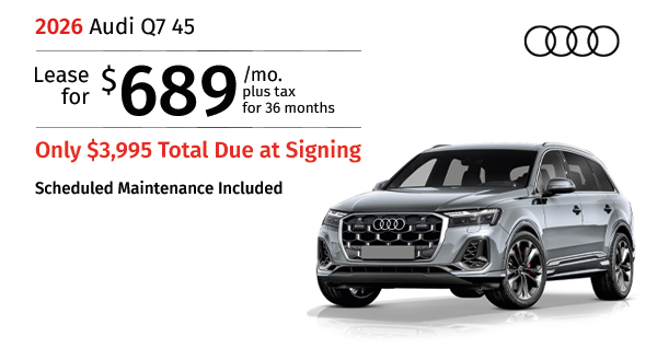 2026 Audi Q7. Stock #TD009188. MSRP $67,145. $689/mo. plus tax 36 months lease. $5000 Bonus cash. $3,995 Total due. Includes down payment, tax, first payment, tag, acquisition fees, dealer fee, and dealer installed options, if any. $0 security deposit. Lease...Request More Info