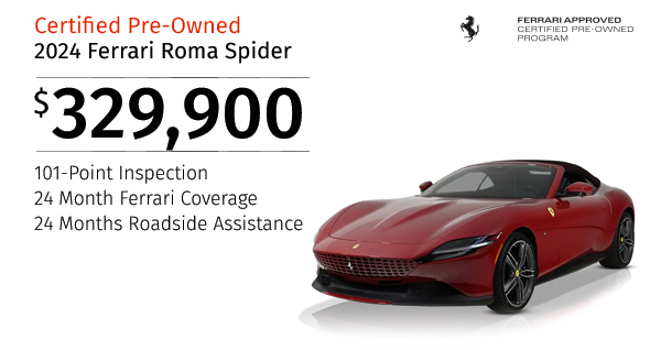 2024 Ferrari Roma Spider Stock# 11717A Selling Price $329900. Photos are for illustration only. Subject to availability/sale. Offer Ends 10/31/2025.Request More Info
