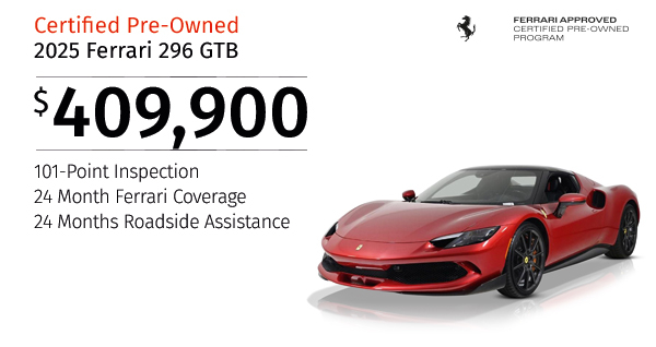 2025 Ferrari 296 GTB Stock# S0313774P Selling Price $409900. Photos are for illustration only. Subject to availability/sale. Offer Ends 10/31/2025.Request More Info