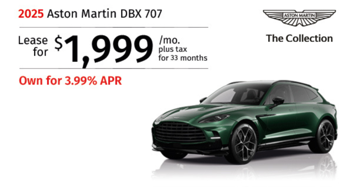 2025 Aston Martin DBX 707 Stock #STV12524, STV12150. MSRP $296,120. $1,999/mo. plus tax, 33-month lease. $34,873 Total due at signing. Includes down payment, tax, first payment, tag, acquisition fees, dealer fee, and dealer installed options, if any. $0 security deposit....Request More Info