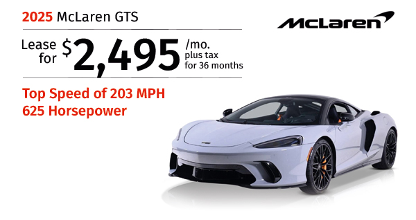 2026 McLaren GTS Coupe. Stock #MC703. MSRP $246,358. $2,495/mo.+tax. 36-month lease. $30,165 total due at signing. Includes first payment, tag, acquisition fee, dealer fee, and dealer installed options, if any. $0 security deposit. Lease end value $164,219. 2,500 miles per...Request More Info