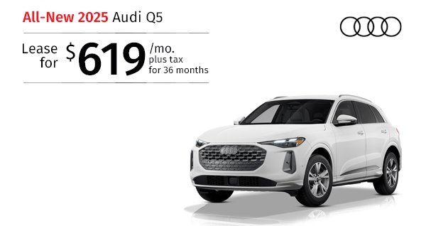 2025 Audi Q5 All New. Stock #S2068968. MSRP $57180. $619/mo.36 months lease. $0 Rebate. $3385 Total due. Includes down payment, tax, first payment, tag, acquisition fees, dealer fee, and dealer installed options, if any. $0 security deposit. Lease end value...Request More Info