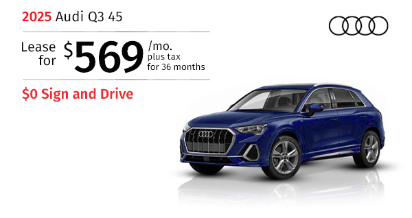 2025 Audi Q3 45. Stock #S1092452. MSRP $43935. $569/mo.36 months lease. $1500 Rebate. $0 Total due. Includes down payment, tax, first payment, tag, acquisition fees, dealer fee, and dealer installed options, if any. $0 security deposit. Lease end value $25992....Request More Info