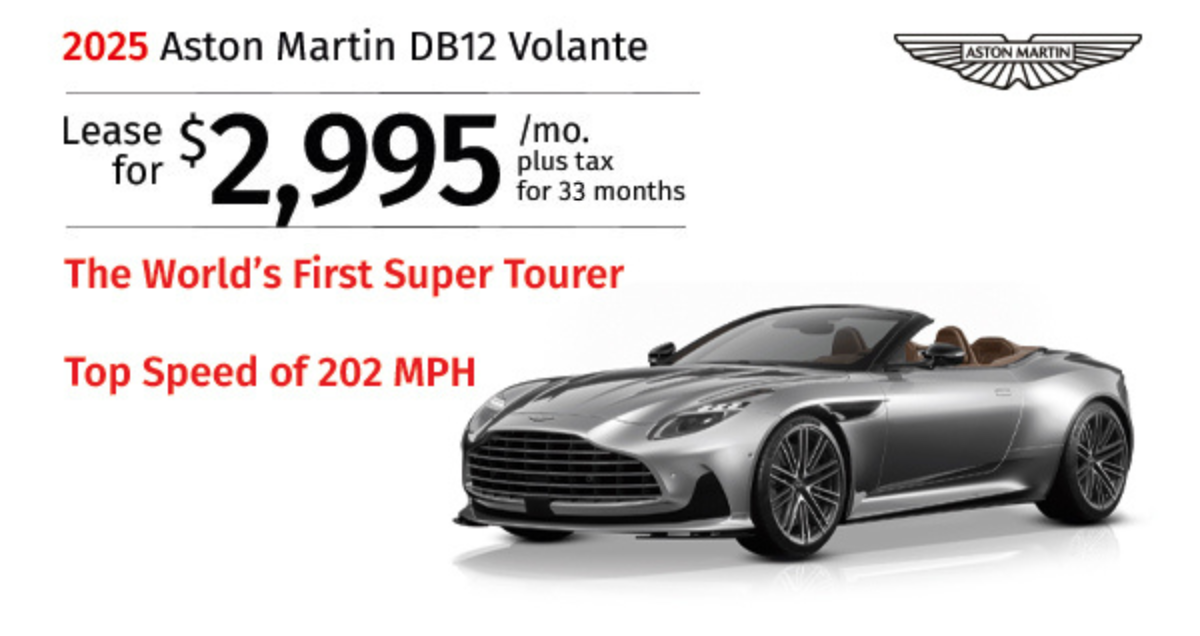 2025 Aston Martin DB12 Volante Stock #SGM16361. MSRP $327,825. $2,995/mo. plus tax, 30-month lease. $35,939 Total due at signing. Includes down payment, tax, first payment, tag, acquisition fees, dealer fee, and dealer installed options, if any. $0 security deposit. Lease...Request More Info