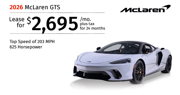 2026 McLaren GTS . Stock #TW003571. MSRP $246,450. $2,695/mo. plus tax 24 months lease. $30,444 Total due. Includes down payment, tax, first payment, tag, acquisition fees, dealer fee, and dealer installed options, if any. $0 security deposit. Lease end value...Request More Info