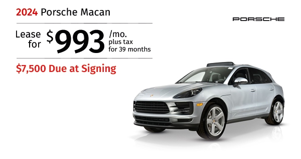 2024 Porsche Macan. Stock #804208. MSRP $76620. $993/mo. plus tax 39 months lease. $ Rebate. $7500 Total due. Includes down payment, tax, first payment, tag, acquisition fees, dealer fee, and dealer installed options, if any. $0 security deposit. Lease end...Request More Info