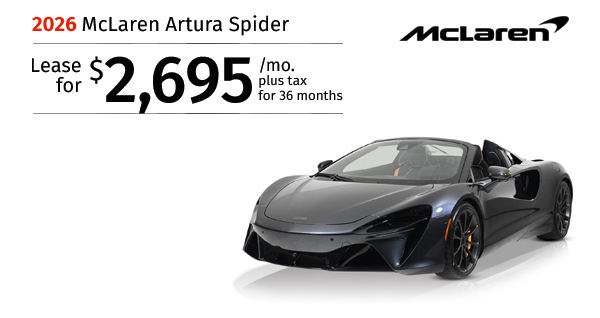 2026 McLaren Artura Spider. Stock #TW004291. MSRP $321,100. $2,695/mo. plus tax 36 months lease. $30,551 Total due. Includes down payment, tax, first payment, tag, acquisition fees, dealer fee, and dealer installed options, if any. $0 security deposit. Lease end value...Request More Info