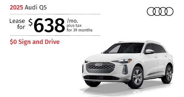 2025 Audi Q5 . Stock #S2075910. MSRP $56650. $638/mo. plus tax 39 months lease. $0 Bonus cash. $0 Total due. Includes down payment, tax, first payment, tag, acquisition fees, dealer fee, and dealer installed options, if any. $0 security deposit....Request More Info
