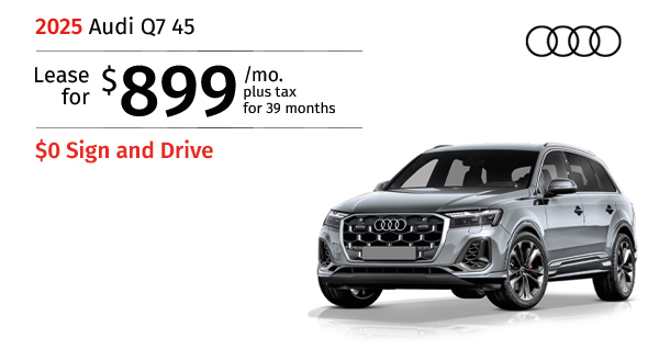 2025 Audi Q7 . Stock #SD018013. MSRP $75505. $899/mo. plus tax 39 months lease. $0 Bonus cash. $0 Total due. Includes down payment, tax, first payment, tag, acquisition fees, dealer fee, and dealer installed options, if any. $0 security deposit....Request More Info